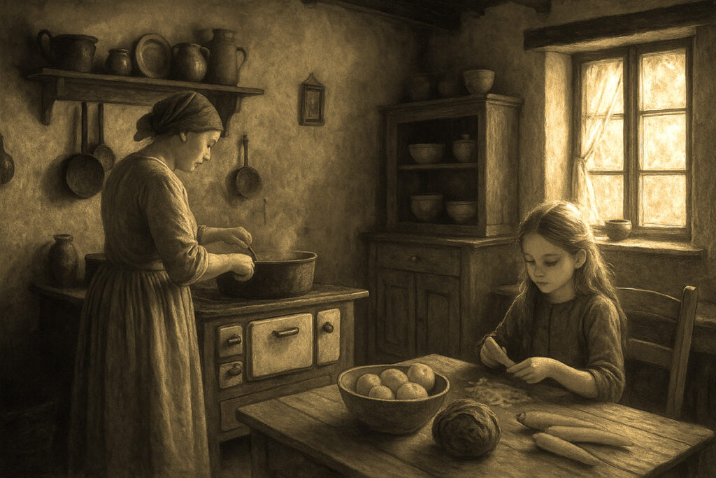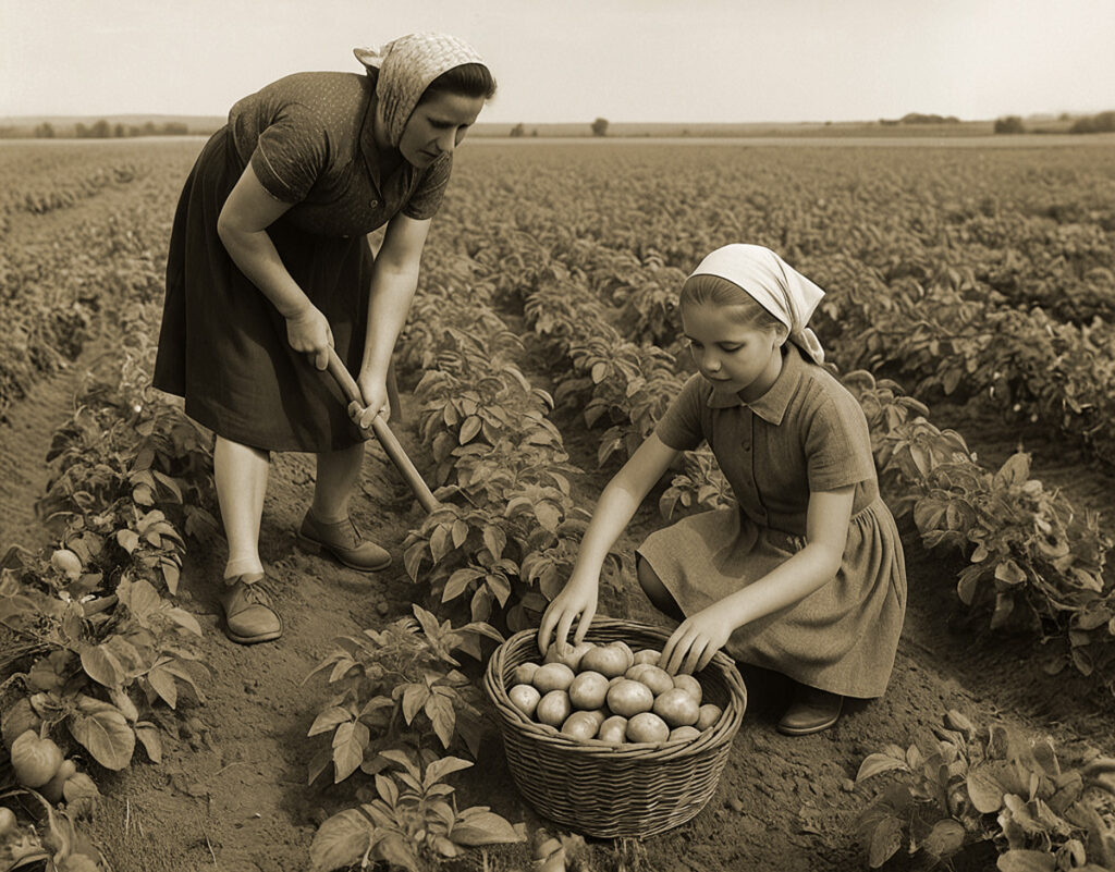 Reggel ötkor már a földeken voltunk. Anyámmal együtt kapáltunk, ritkítottuk a répát, szedtük a krumplibogarat – egész addig, míg a nap túl erősen nem tűzött, és hazatértünk. Otthon sem várt pihenő: főzni kellett. Anyám a tűzhely mellé állt, én pedig pucoltam a krumplit, zöldséget, mosogattam, söpörtem, port töröltem, disznóknak, baromfinak szedtem le a hullott gyümölcsöt, daráltam kukoricát, csójánt gyűjtöttem a kacsáknak.